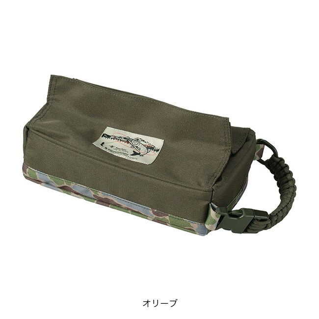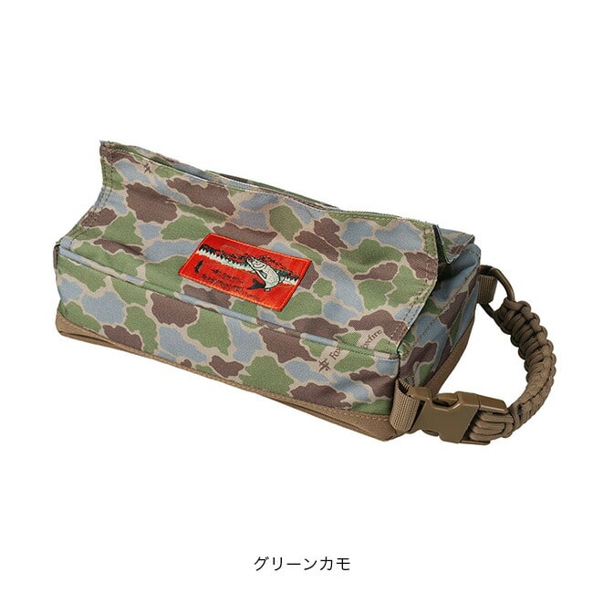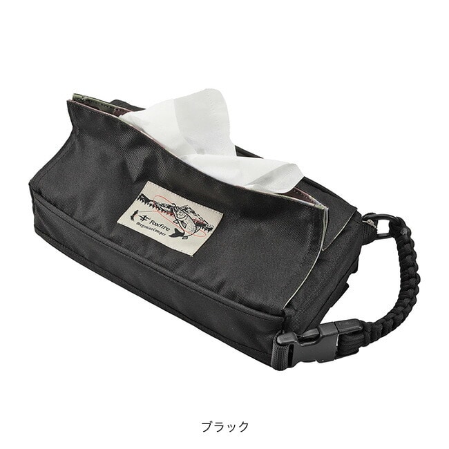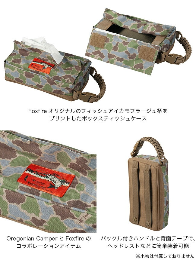 Foxfireオリジナルのフィッシュアイカモフラージュ柄をプリントしたボックスティッシュケースです。バックル付きのハンドルと裏面のテープによりキャンプチェアや車のヘッドレスト等、様々な場所に取り付けることができます。