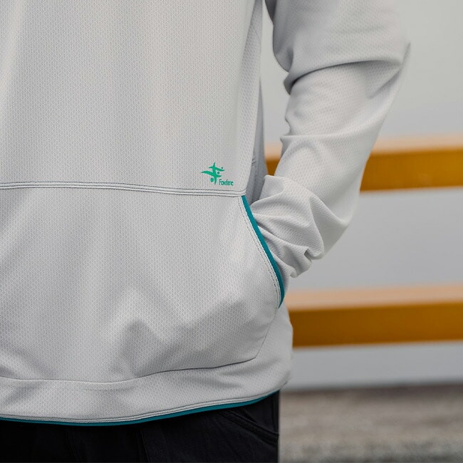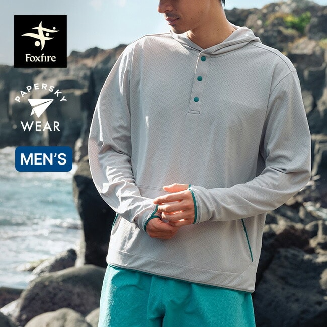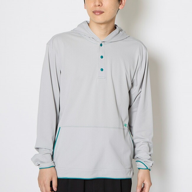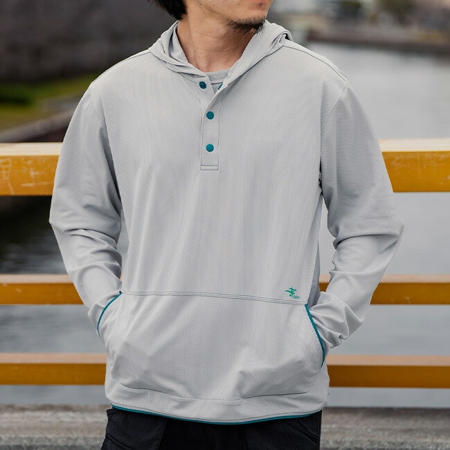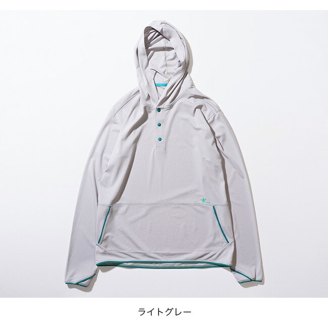 防虫、吸汗速乾、UVカット機能を持つトランスウェット・スコーロン素材のプルオーバーフーディです。通気性に優れたメッシュ地とキャップの上からかぶってもゆとりがあるフード形状により、南国でのアクティビティにも最適。