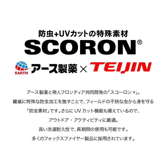 とまっても、刺されにくく、逃げていく画期的な防虫性能。『スコーロン®』は、アース製薬の開発した防虫剤を、帝人グループのナノレベルの接着技術により生地に固定した防虫繊維。従来の防虫素材の弱点であった洗濯耐久性が飛躍的に向上し、洗濯を30回繰り返しても防虫機能を維持できます。蚊やマダニにのいる野外や、日焼けが気になるさまざまなシチュエーションでの着用が可能です。(注:スコーロン®は、帝人フロンティア株式会社の防虫加工素材の登録商標です。)