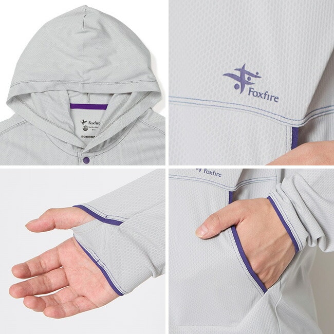 通気性に優れたメッシュ地とキャップの上からかぶってもゆとりがあるフード形状により、盛夏でのアクティビティにも最適。袖口はサムホール仕様で、手の甲まで虫や日焼けからガードします。