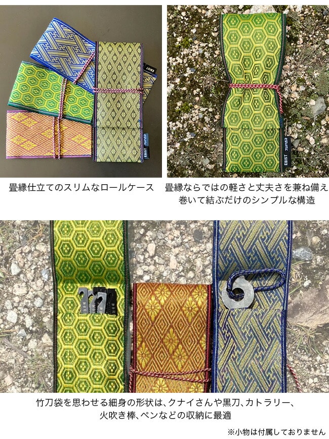 「OFUKUROSAN」は、道具をやさしく包み守る存在として名付けられた、畳縁仕立てのスリムなロールケースです。まるでおふくろさんのように、道具を守り、連れていくやさしさをイメージし、キャンプ場のオーナーの一言から生まれました。