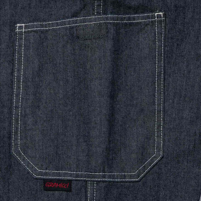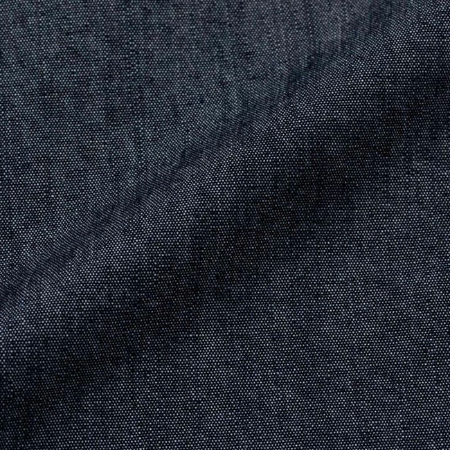 岡山産のシャンブレーは、昔ながらの織機によって、ゆっくり丁寧に織られ、非常に雰囲気があり、軽くソフトな着用感です。たて糸にインディゴ糸、よこ糸は白糸で、デニムのような色合いながらもシャンブレー独特の霜降り調の風合いがあります。