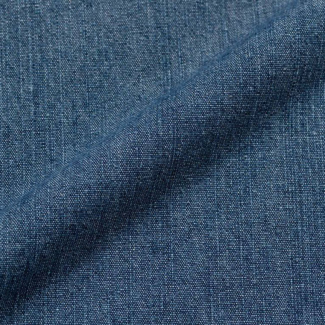 岡山産のシャンブレーは、昔ながらの織機によって、ゆっくり丁寧に織られ、非常に雰囲気があり、軽くソフトな着用感です。たて糸にインディゴ糸、よこ糸は白糸で、デニムのような色合いながらもシャンブレー独特の霜降り調の風合いがあります。