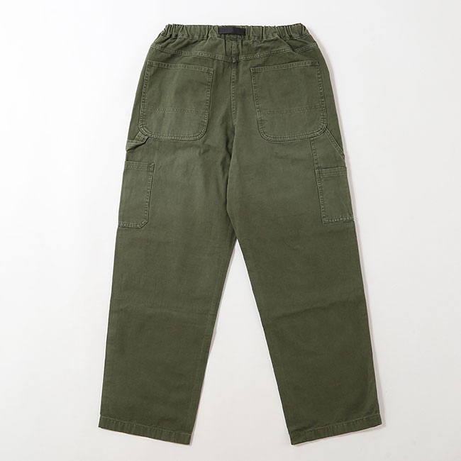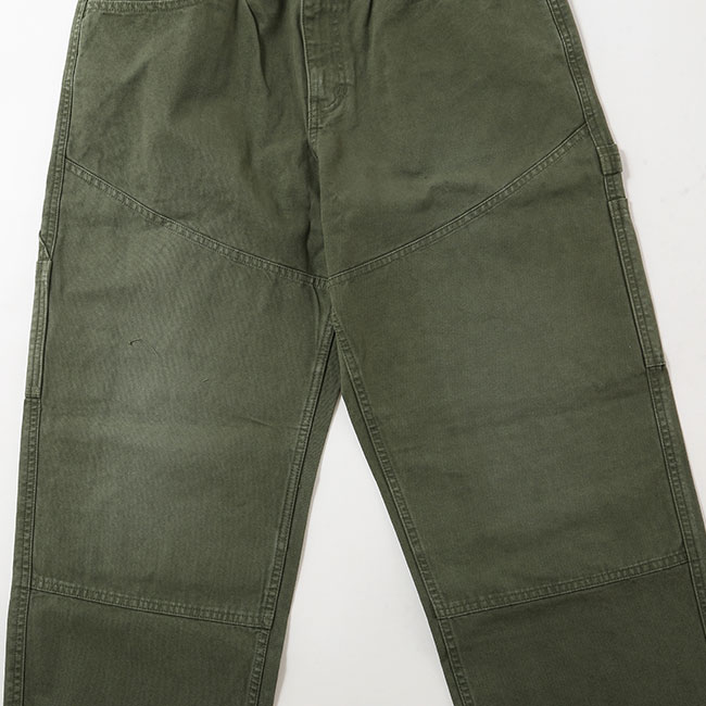 ハンマーポケットを含む7つのポケット、ループといったワークディテールを備えた、ゆとりあるシルエットのダブルニーパンツです。ドライタッチな9oz.のキャンバス素材は、製品加工による深い色合いです。