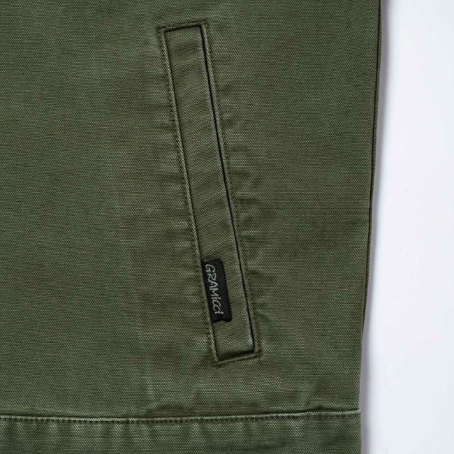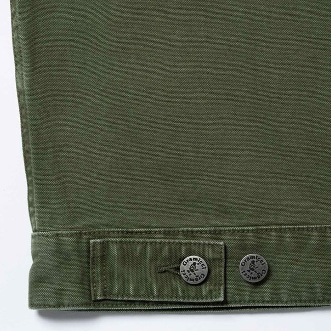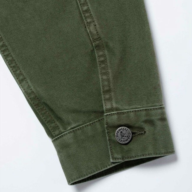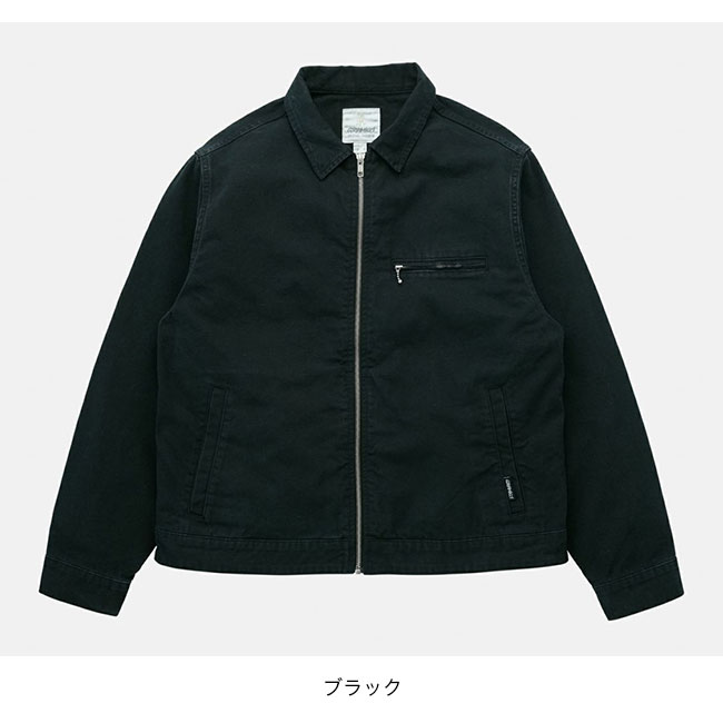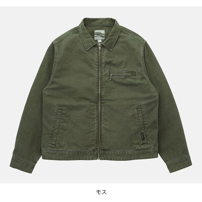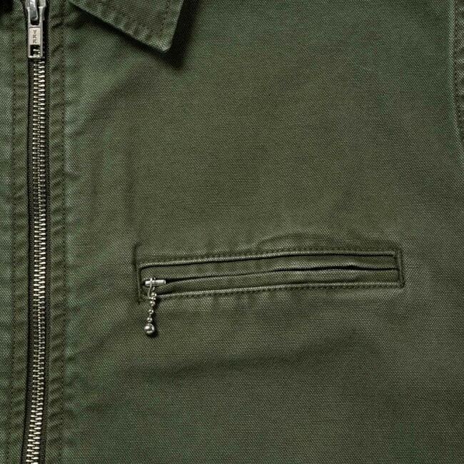 両腰のポケットに加え、左胸にジップポケットを備えたジップアップジャケットは、ドライタッチな9oz.キャンバス素材で、製品加工による深い色合いです。