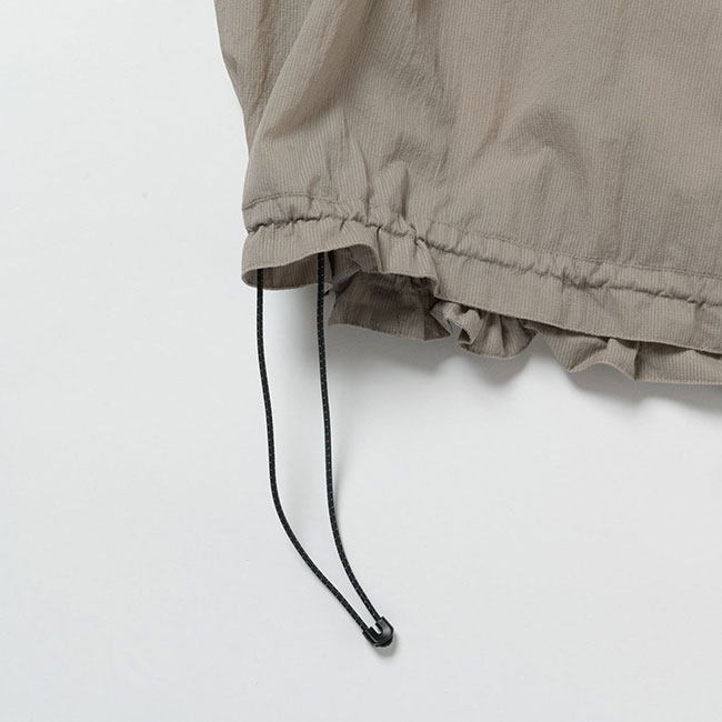 細番手の糸による高密度リップストップ素材は、透明感があり、着ていることを忘れるほどソフトでエアリーな軽さです。パッカブルで持ち運びに便利で、軽撥水機能を備えていますので、突然の雨や肌寒い時の風よけなど重宝します。