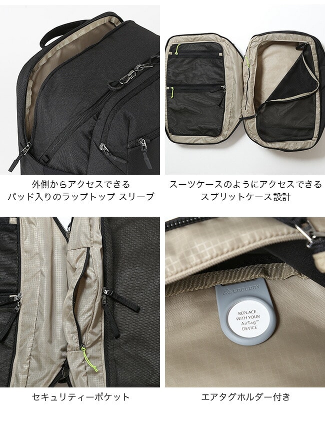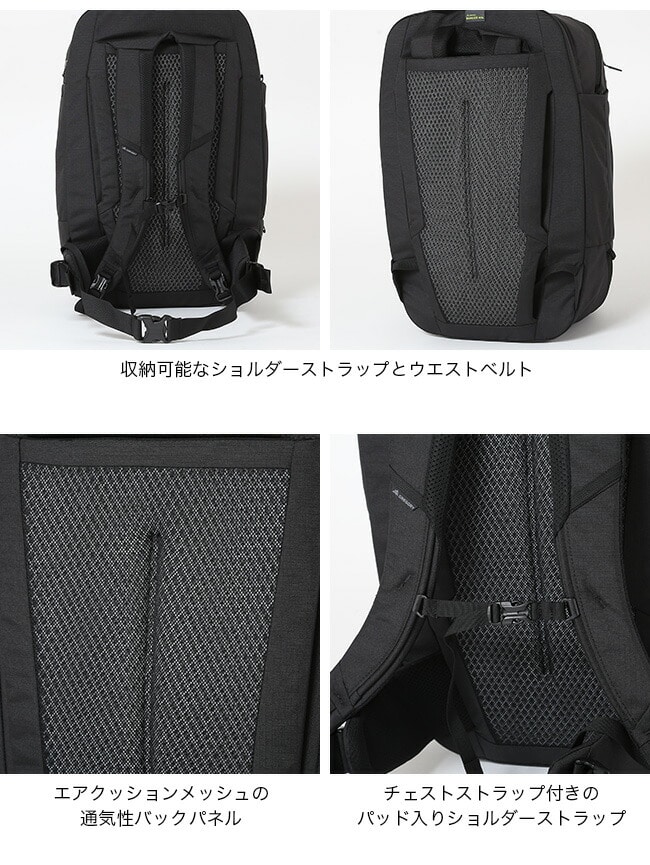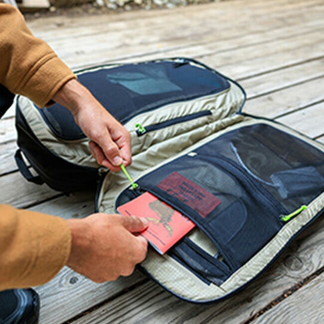 スマートな外部収納機能により、必需品を手元に置いておけるほか、移動中のアイテムにすっきりとアクセスでき、到着時に必要なものも整理しやすく設計されています。四方にパッドが入った構造と、90%以上が空気で構成されたエアクッションメッシュのバックパネルがギアをしっかり保護しながら、高い通気性で長時間の移動でも快適さを保ちます。