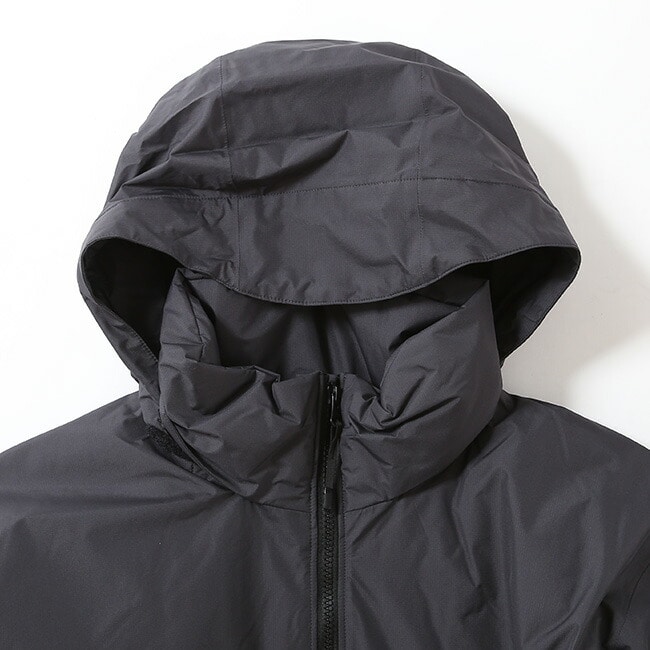 フードは、襟部分に収納できるビルトインフード仕様で、被らないときはスタンドカラーとして着用可能です。