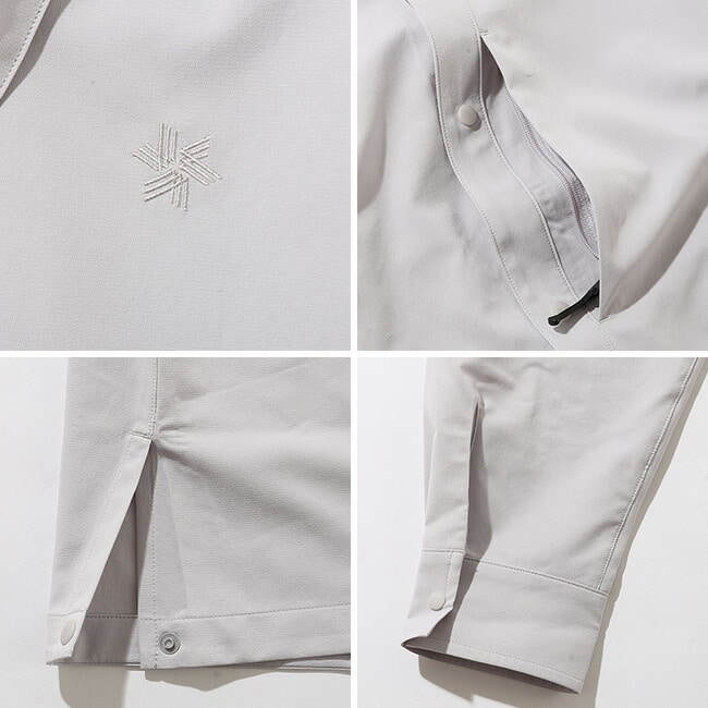 ウインドシェルの選択肢のひとつとして着用できる機能性と、洗練されたデザインを兼ね備えています。ストレッチ性に優れ、通気性も備えた二重織組織の薄手生地を採用。