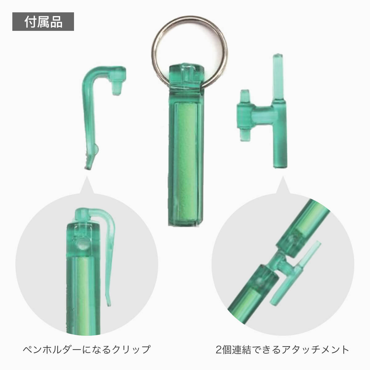 ペンホルダーになるクリップ、2個連結できるアタッチメントが付属しています。