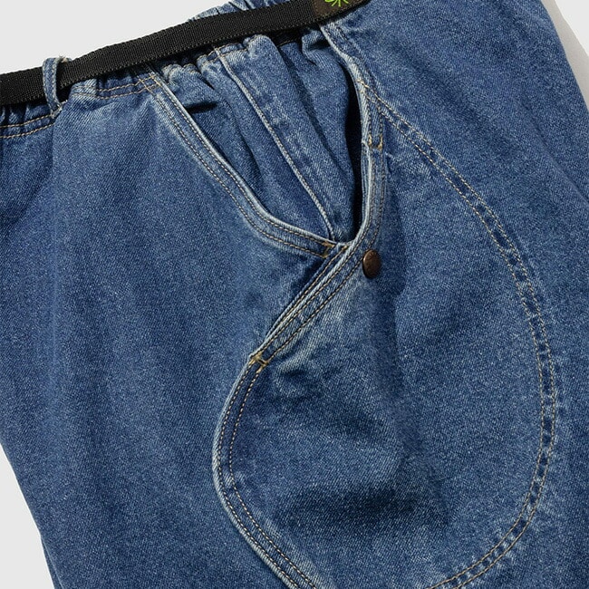 曲線を描く特徴的なポケットパターンはステッチワークのアクセントのみならず、物を入れた際の膨らみやシルエットの崩れを抑える設計がされています。ウエストにはウェービングベルトを使用し細かな調整が可能。