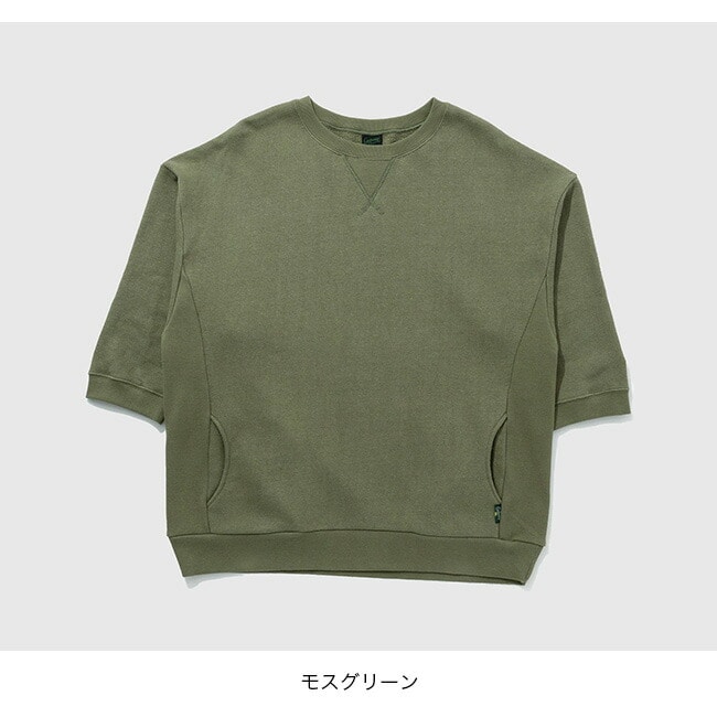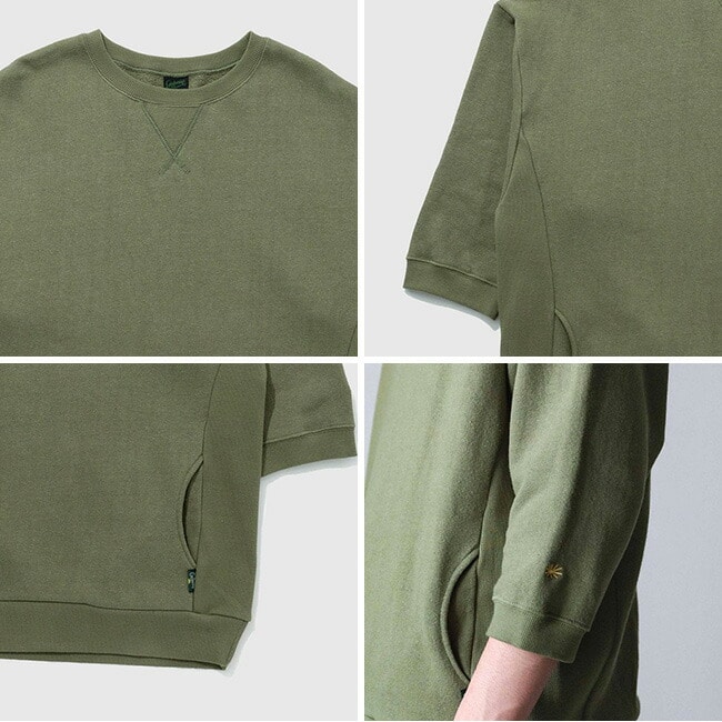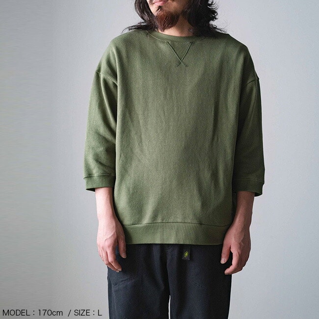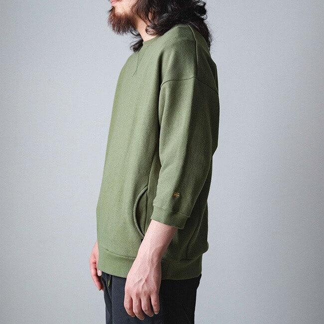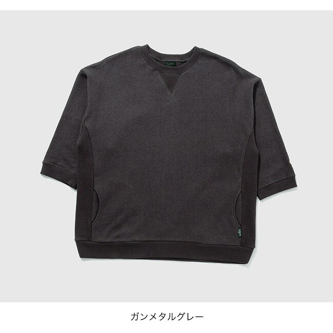 袖を半端丈に設定し、ガゼットやサイドパネルなど随所にアクセントを加えたクルーネックシャツです。身幅が広くやや着丈が長いルーズシルエットです。