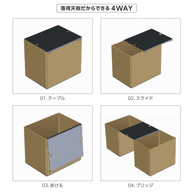 天板を付けることによってテーブルとしての利用できます。テーブルとして利用するときに簡単なスライド機能によって上に載せている物をどかす必要なく荷物を取り出す事が可能。