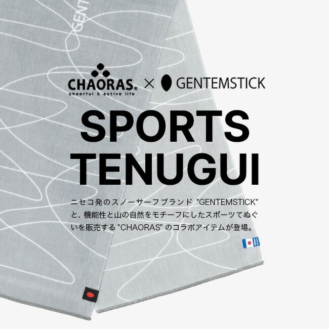 ニセコ発のスノーサーフブランド"GENTEMSTICK"と、機能性と山の自然をモチーフにしたスポーツてぬぐいを販売する"CHAORAS"のコラボアイテムが登場。「スポーツ手ぬぐい」とは、日本の伝統的な手ぬぐいの利点を受け継ぎ大切にしながら、現代のアウトドアスポーツシーンにマッチさせた新しい日本製のアイテム。