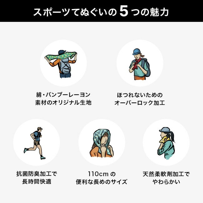 通常の手ぬぐいよりも長い110cmのロングサイズは、首や頭に巻きやすく、生地の端がオーバロック仕上げのため、ほつれを防ぎかつ速乾性を邪魔しない機能的で使いやすい仕上がりになっています。