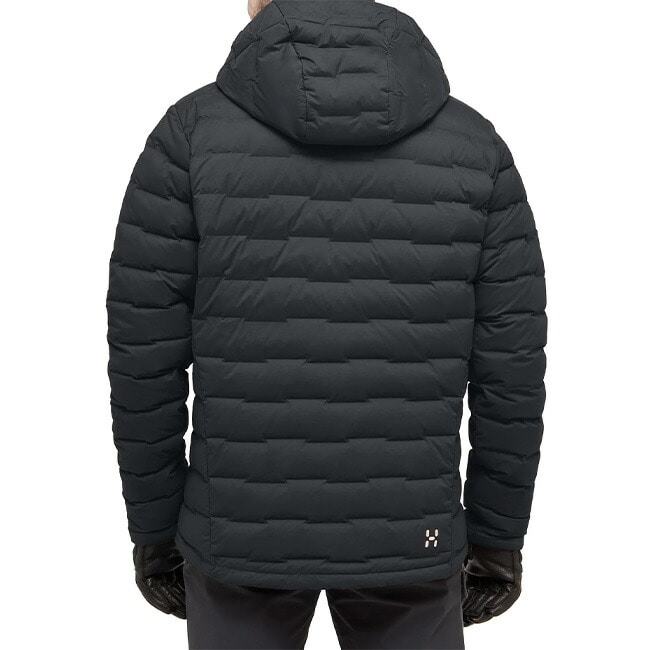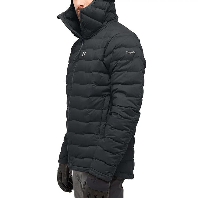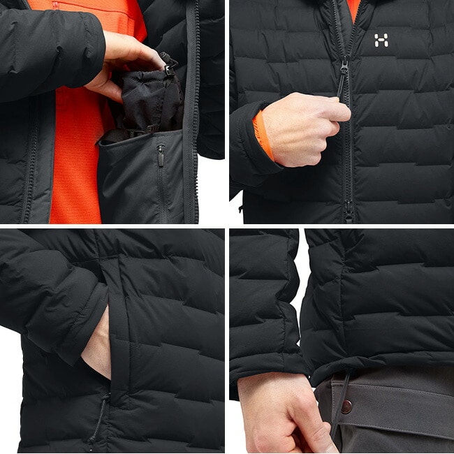 登山やクライミングでの使用を念頭に置いてデザインされた、伸縮性のあるダウンフーディ