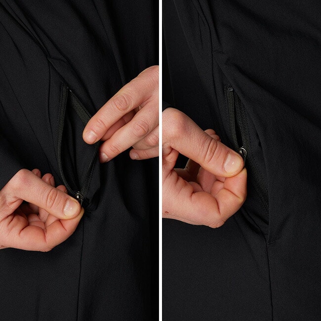 ゆったりとしたロング丈のシルエットに加え、両サイドのポケット(右側には貴重品を収納できる隠しセキュリティポケット付き)を配置。