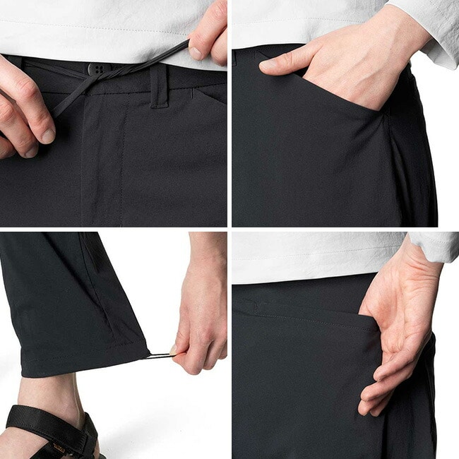 ウエストには調整が可能な紐を内臓し、裾の絞りを調整するドローコード、両側のサイドポケットと右ヒップにはバックポケットを配し、さらに本体をコンパクトに収納できるパッカブル仕様のため、アクティビティの移動中や旅行の際の持ち運びに便利です。