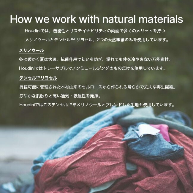 軽量で機能的な生地には、優れた天然素材のメリノウールとテンセル®を使用しています。多機能かつ高性能なミッドレイヤーを作ることは、Houdiniがもっとも得意とする分野です。
