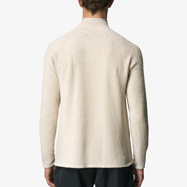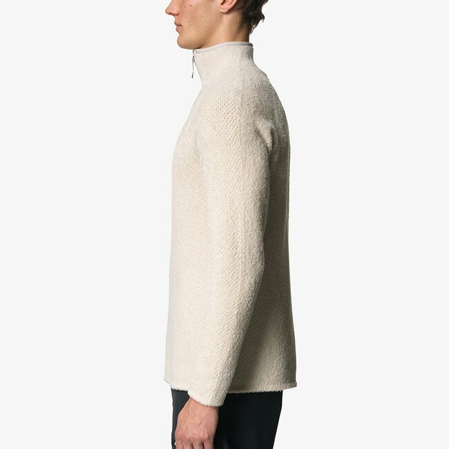 Lykan Half Zipは、独自のテクスチャードヤーンを用いて一着丸ごと編み上げられており、非常に柔らかく、軽量で、伸縮性に富んだ起毛感のある素材です。
