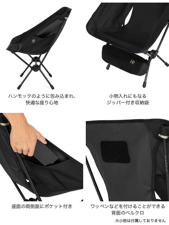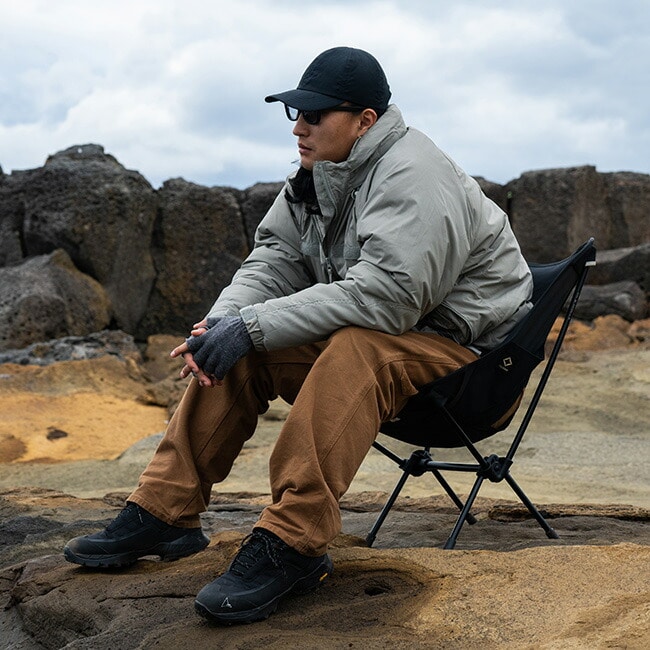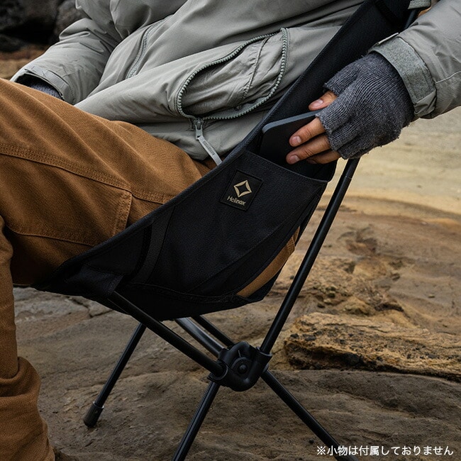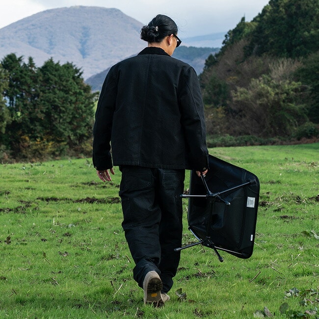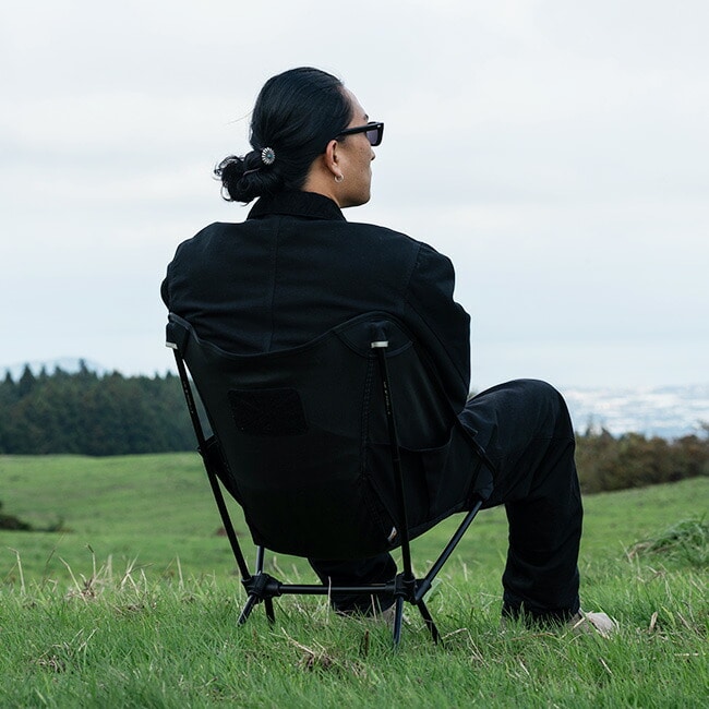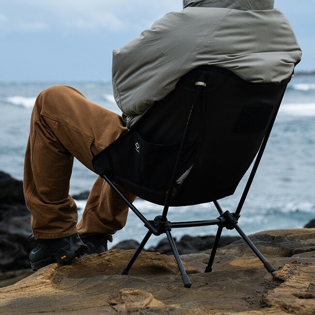 ヘリノックスのチェアは持ち運びに便利なコンパクトさが特徴のひとつ。故に、無駄を削いだデザインの中で座り心地の快適性を追求しています。