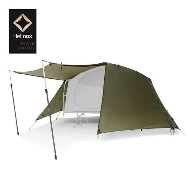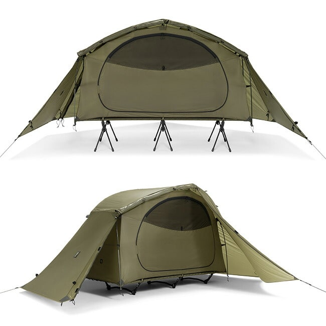 タクティカル コットテントソロを単体で野外で使用する際には必須のフライシートとなります。コットテントソロのフライの前面にある2つのドアを全て巻き上げて完全に開放する事ができます。