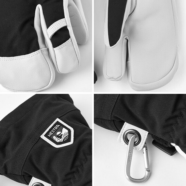 親指外側のカラビナループは降雪中にぶら下げてもグローブ内部が濡れない仕様。