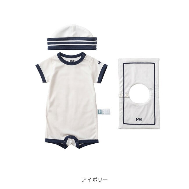 HELLY HANSENらしいマリンテイストを取り入れた、キャップとロンパースとスタイの3点セット。
