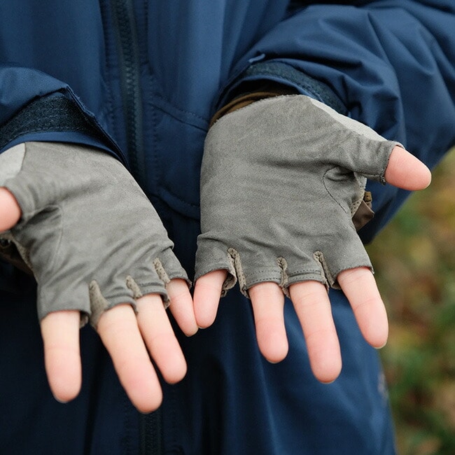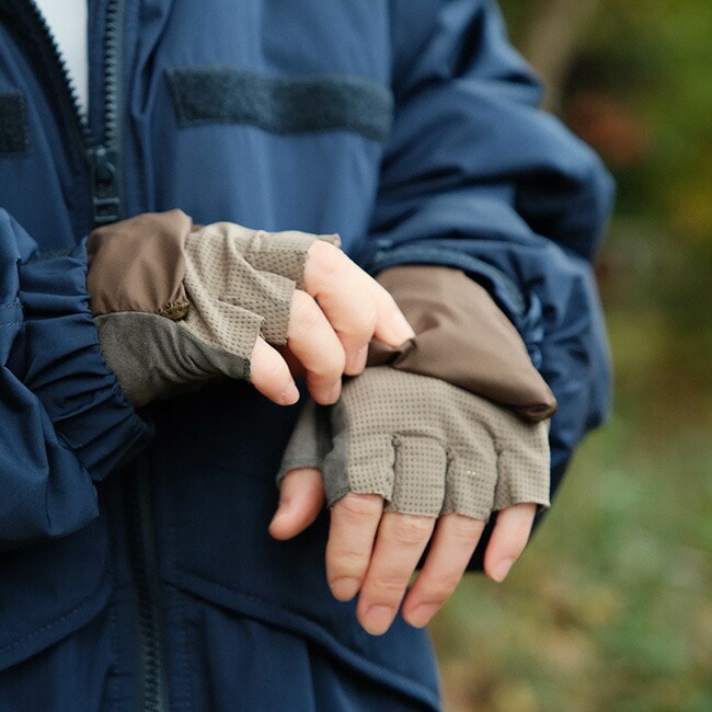 ハーフフィンガーグローブに収納式のフードを搭載したトレイルランニング用グローブ