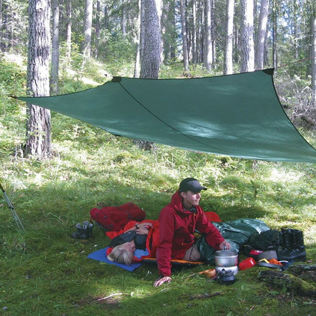 手の上に載るほどコンパクトになり、軽量かつ強靭なヒルバーグのタープ