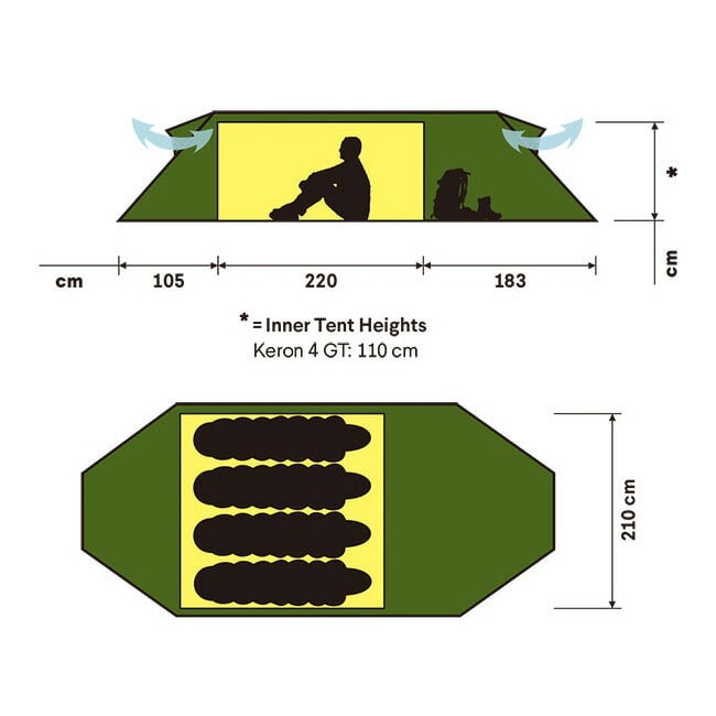 Keron 4 GT では4人使用時に1人あたり1.6kgとなり、標準と拡張型の2つの前室を備えた構成は、装備が多いグループでのミッションに理想的で、最大限に活用できるインナーテント空間と出入りの柔軟性を提供します。