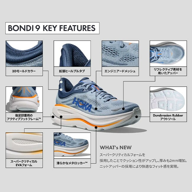 HOKAラインナップの中で人気の高いボンダイシリーズから、隅々まで一新されたボンダイ9(BONDI 9)が登場。日々の走りに最高の快適性をもたらすボンダイの代名詞である柔らかく弾むような走りを実現するため、スタックハイトを増やし新しいプレミアムフォームミッドソールを追加しました。