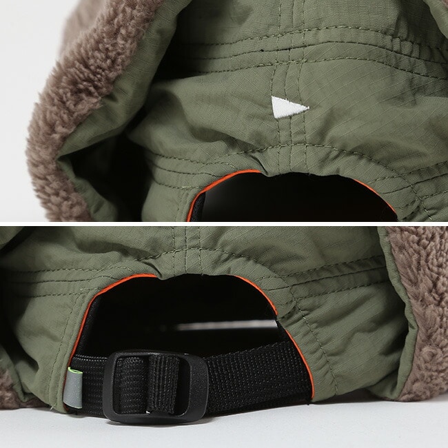 フラップは耳だけでなく頬まで覆える設計で、防寒性を強化。裏地にはメッシュ生地を使用し、ムレを軽減。