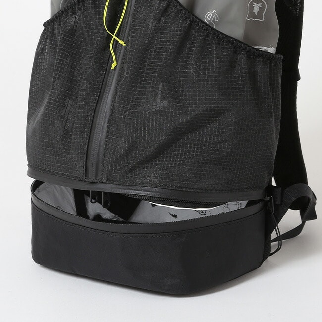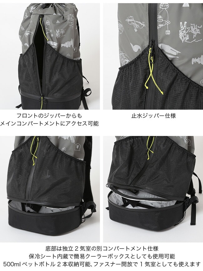 中央のフロントファスナーから直接出し入れができ、大型のフロントポケットを装備。また最大の特徴は底部が2気室となっており、保冷シート内蔵により冷えたドリンクや食材をハイク時に携行可能です。