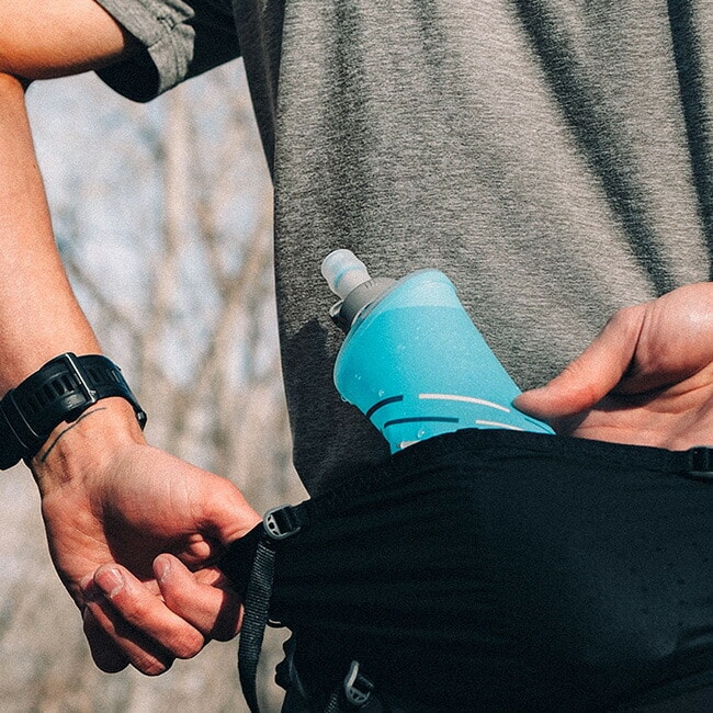 超薄型のフラスクと最小限の28mmキャップは、細いランニング・ベルトなどに収まるデザイン。