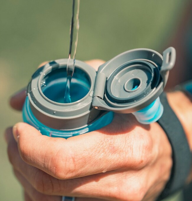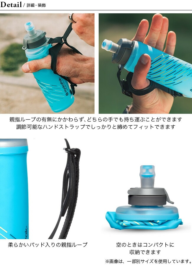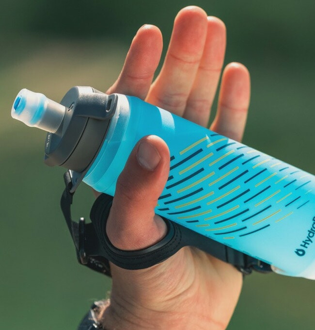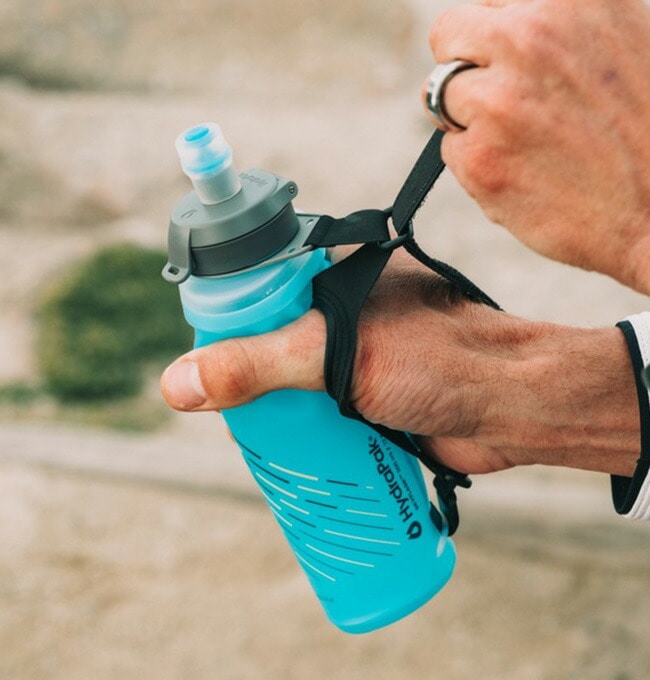 ミニマリストのランナー向けに設計されたスカイフラスク スピードは、調節可能なハンドストラップと革新的なパッド入りの親指ループを備えており、握ったり絞ったりすることなく、どちらの手でもフラスコをしっかりと保持できます。