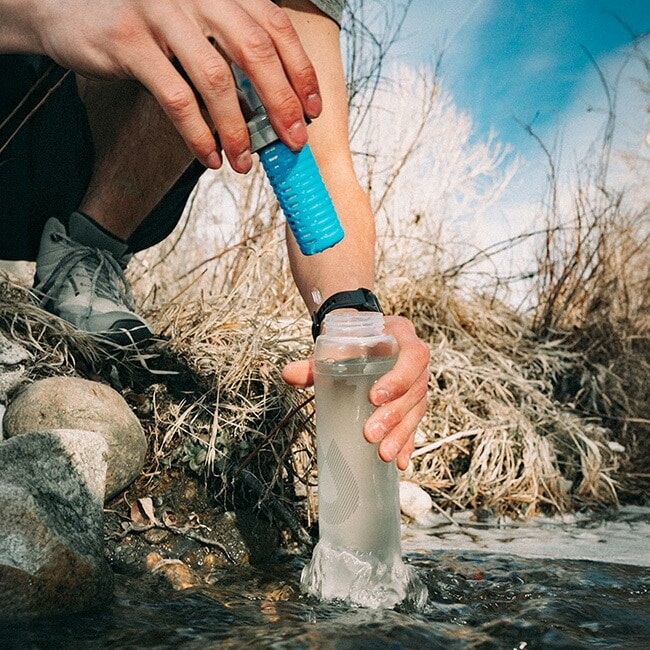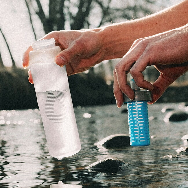 ハイドラパックは、いつものフラスコにフィルターを追加し、汚染することなく水分補給できるシステムを作りました。フィルターは軽量でコンパクトで、上部にねじ込むだけでフラスコから直接飲むことができます。