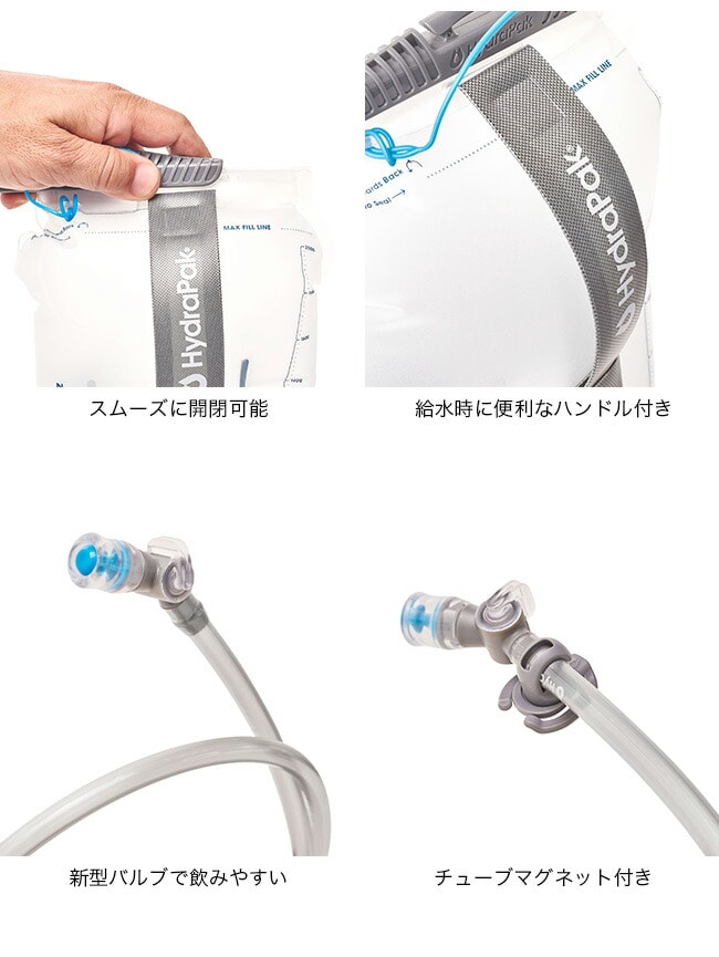 軽量でコンパクト、そして頑丈なハイドレーションです。3Dボトム、シェイプロック(TM)バッフル、そして水筒の横側に取り付けられたホースの取付口、これらのアップデートにより、登山、バックパッキング、ハイキング、トレイルランニング、アドベンチャーレースなど様々なバックパックで優れたフィット感とパフォーマンスを提供します。