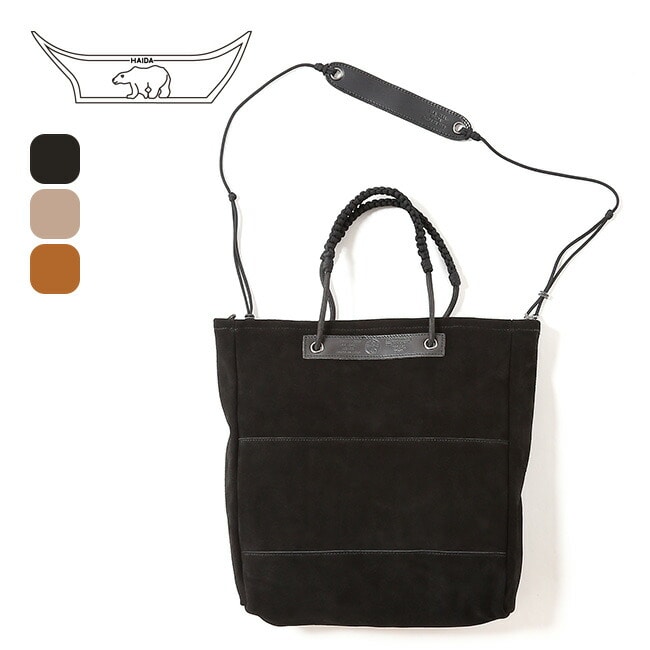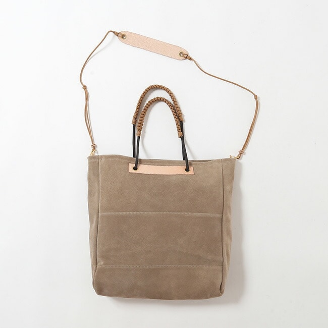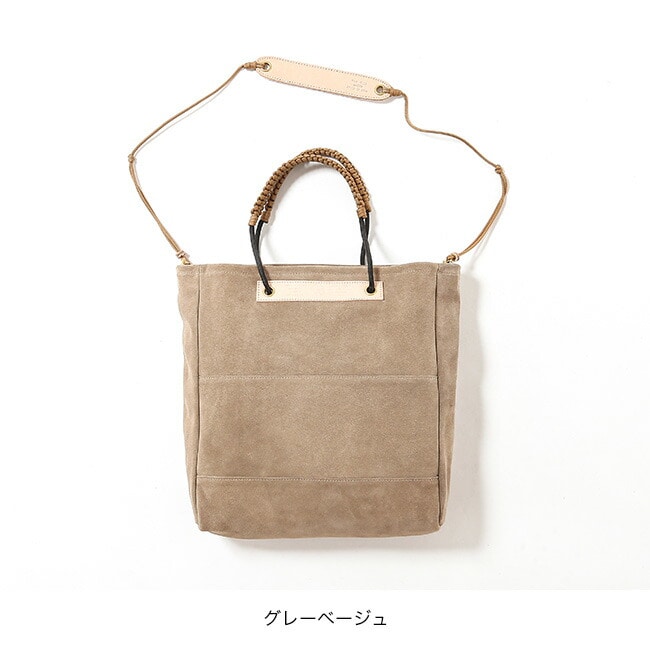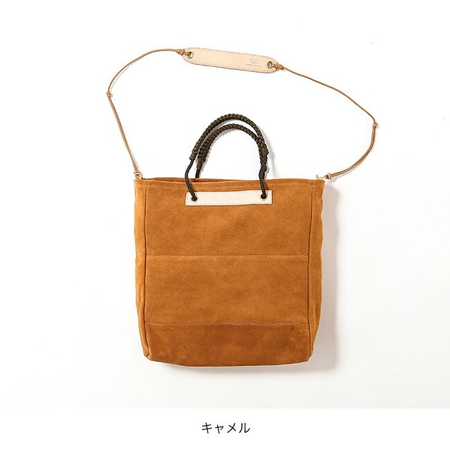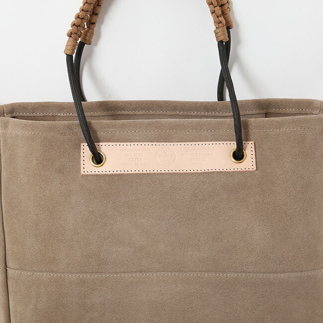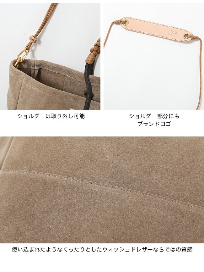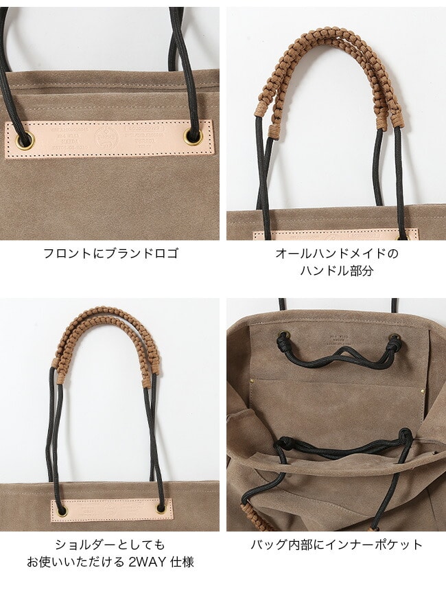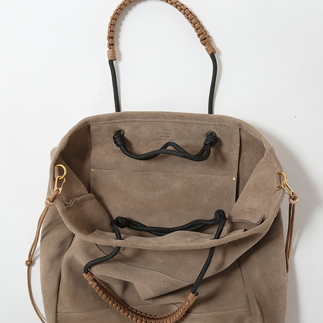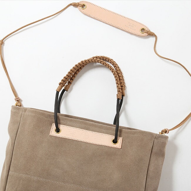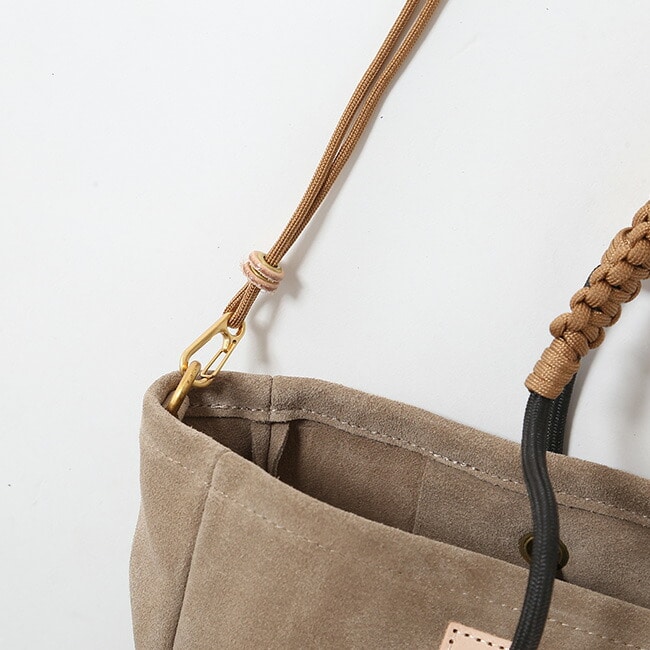 手触りの良いスェード生地とヌメ革を使用し、経年変化が楽しめます。独自のロープの結び方によりハンドルの調節が自在に可能です。