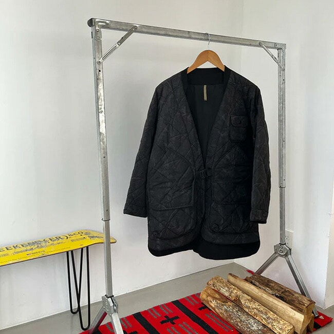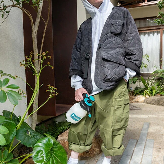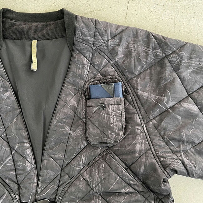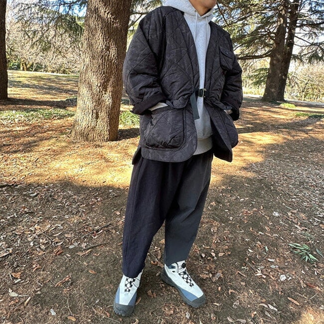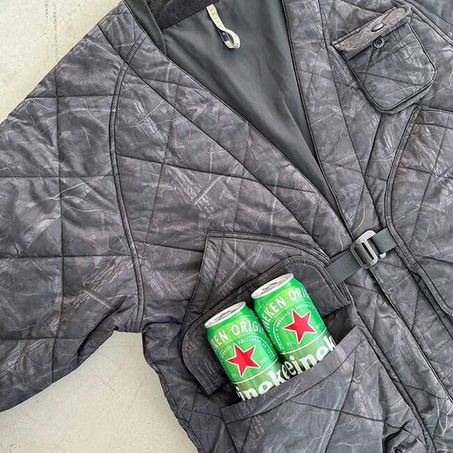 「コンビニまで晩酌用のビールとつまみを手ぶらで買いに行く」をコンセプトにしたハンテン。買ったモノを入れるポケットのベストなサイズ感と寒い時に手を突っ込めるハンドウォーマーポケットなどハンティングジャケットの仕様をオマージュしています。