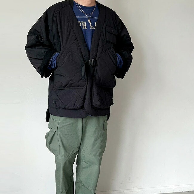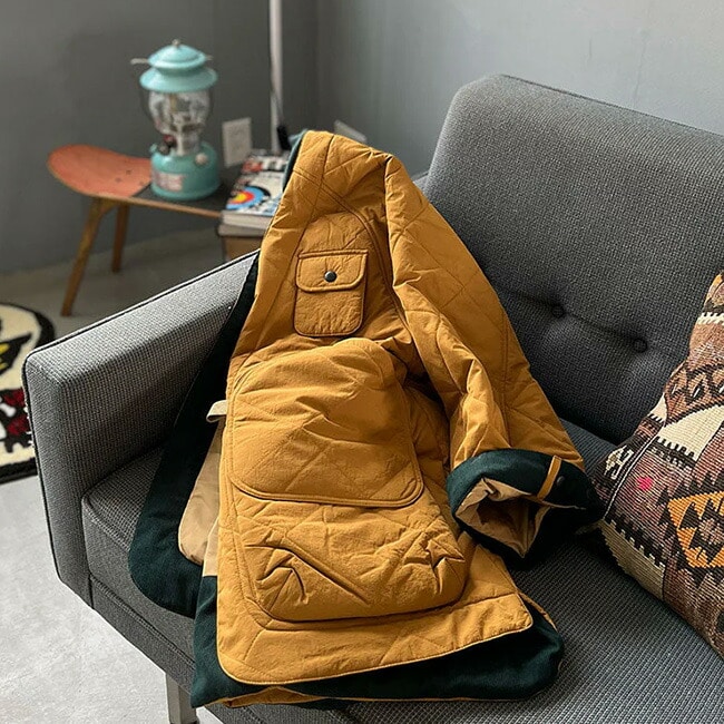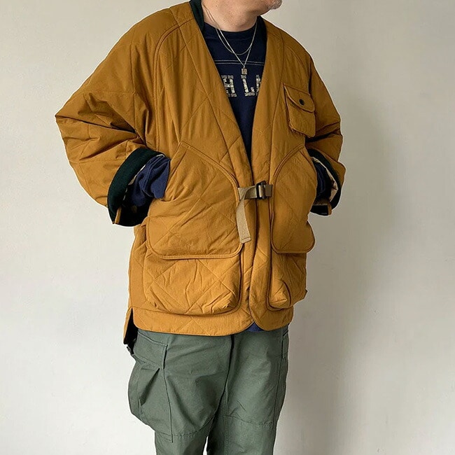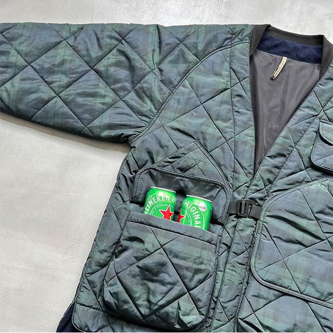 「コンビニまで晩酌用のビールとつまみを手ぶらで買いに行く」をコンセプトに買ったモノを入れるポケットのベストなサイズ感と寒い時に手を突っ込めるハンドウォーマーポケットなどハンティングジャケットの仕様をオマージュすることで機能的にも理想的な家呑み愛好家用DAN-TENがデザインされました。