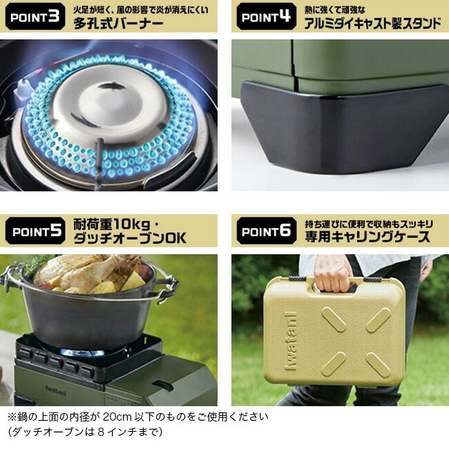 (ダッチオーブンなら8インチまで使用可能) また、炎の脚が短く、風に流されにくいバーナーを搭載しています。