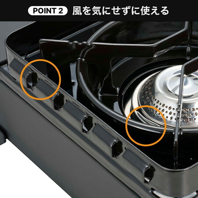 (鍋底が6cm以上)風のある場所で空気は通しても風は通さない当社独自の「ダブル風防ユニット」と炎の脚が短く、風に流されにくい「多孔式バーナー」搭載で、野外でも強い加熱性能が得られます。