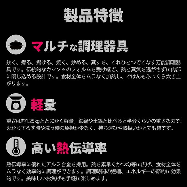 直火・ガス・IHすべてに対応し、家庭でもアウトドアでも活躍。