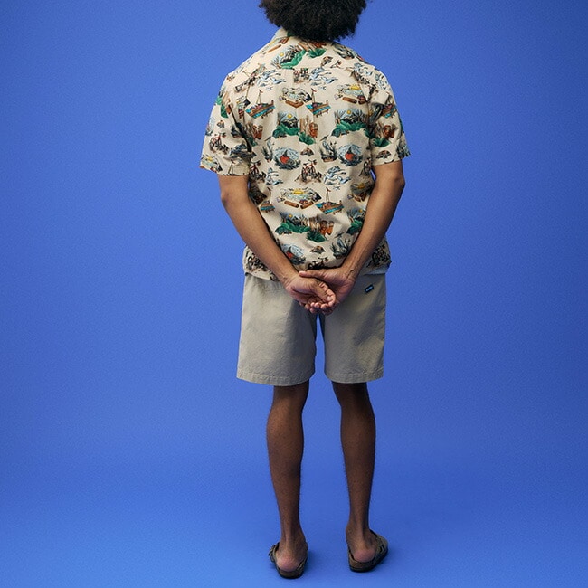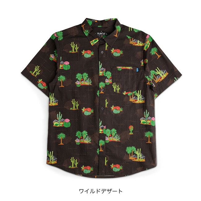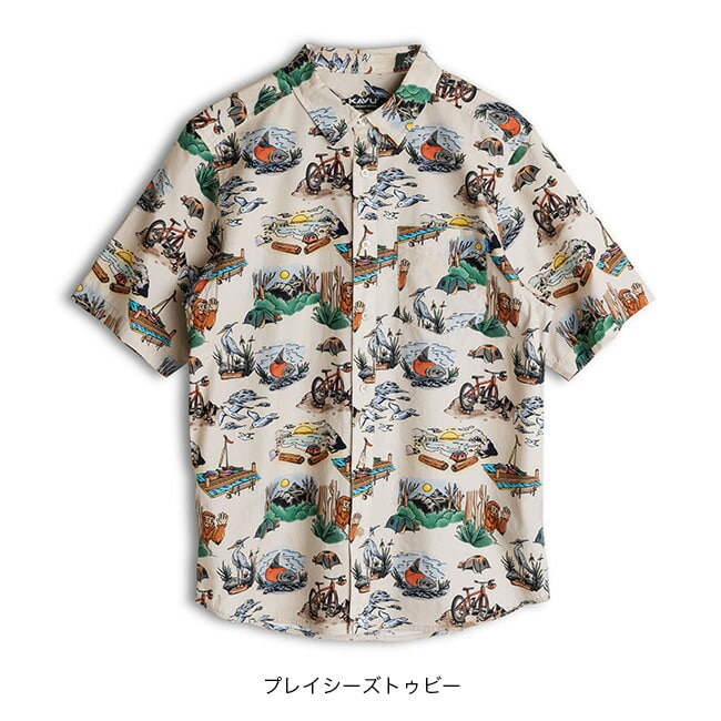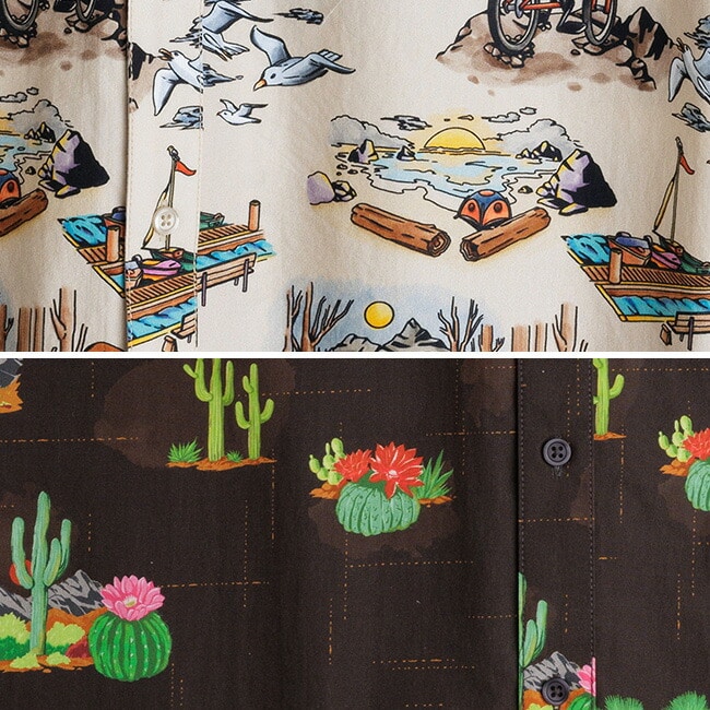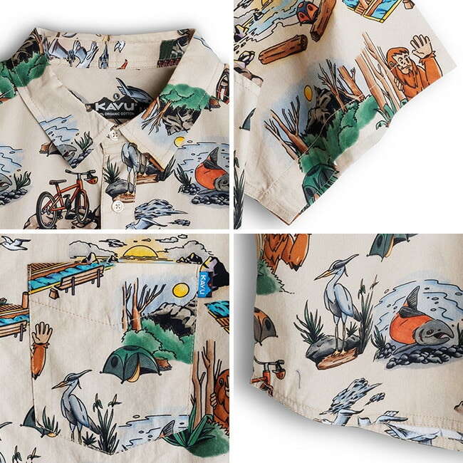 KAVUでは生地のグラフィックを1から手掛けているため、なかなかお見掛けしない個性的な柄のシャツ。ゆったりとした着心地と首袖周りで、ゆったりとした着心地に胸ポケットがアクセント。