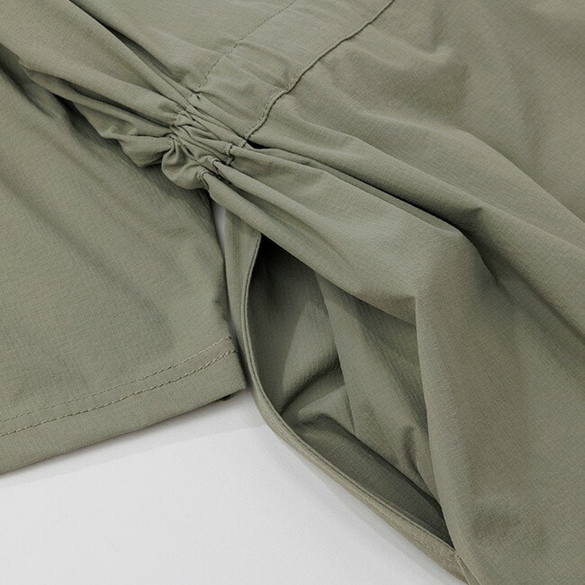 シンプルなデザインの中にアウトドアテイストを感じさせるディテールが光り、1枚でラフに着こなせるアイテムに仕上がっています。腰回りのウェービングテープでシルエットを変えることが出来ます。
