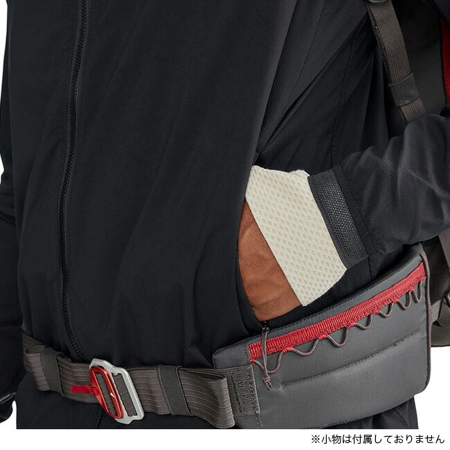 ハンドポケットを高く配置し、登山用ハーネスやバックパックとの相性も抜群です。