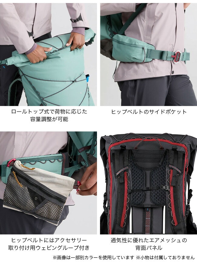 ロールトップ式の開口部は、荷物の出し入れやコンプレッション、オーバーパッキングが容易です。トップのバンジーシステムとフロントのエラスティックコードは、追加ギアを取り付けるためのオプションです。