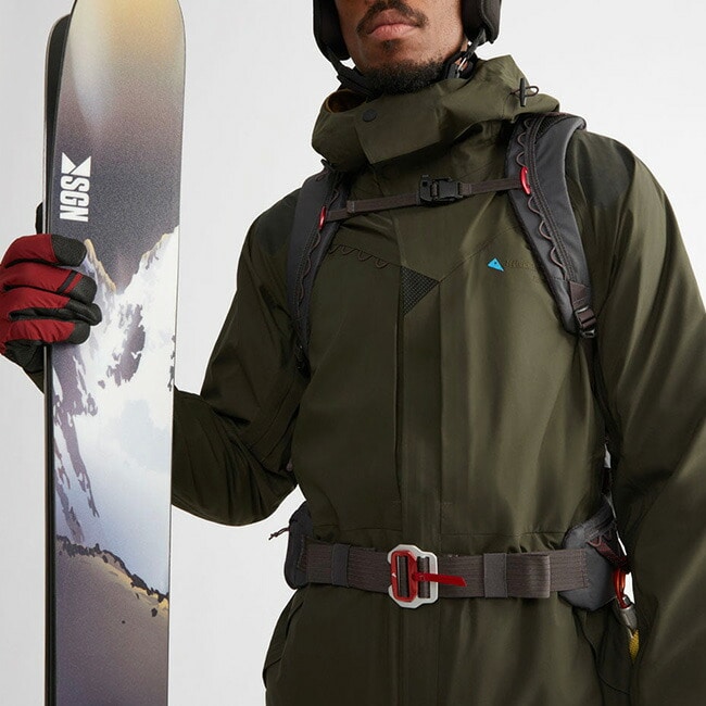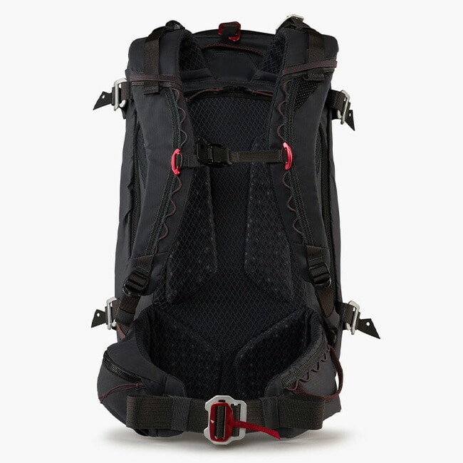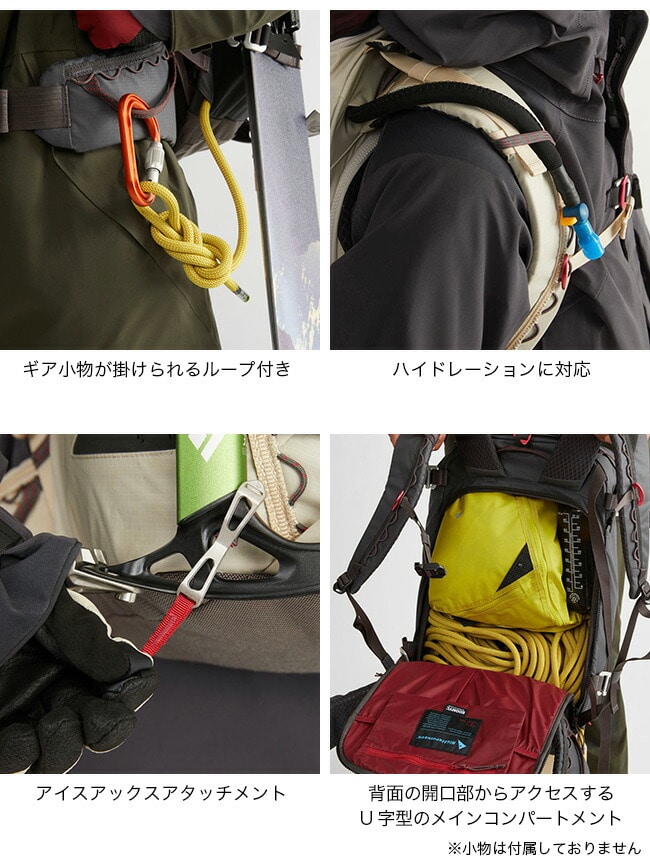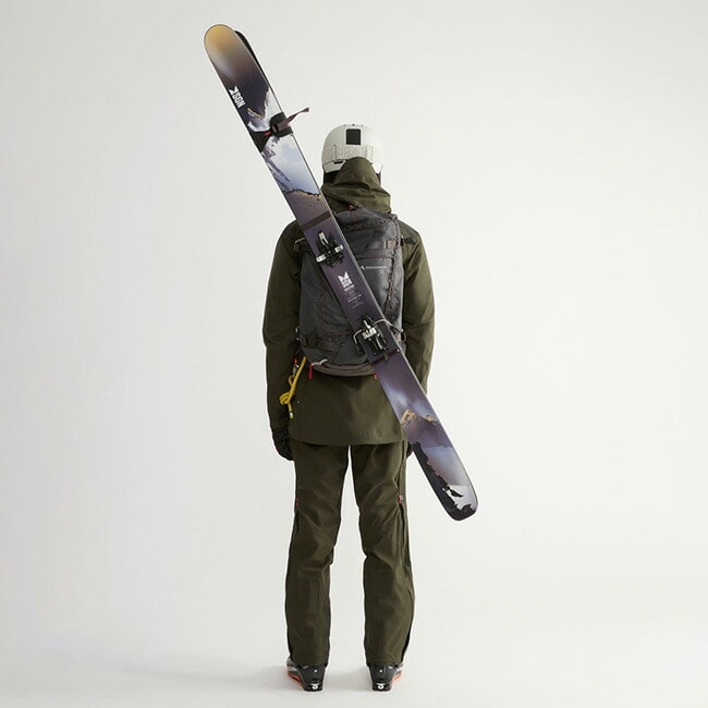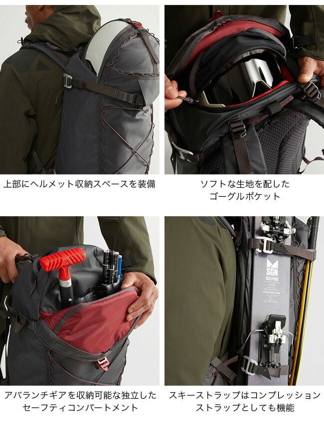 アバランチツールポケット、内蔵ヘルメットホルダー、ゴーグルポケット、アイスアックスホルダーなども装備しています。