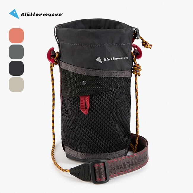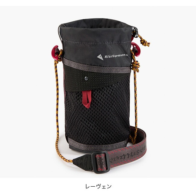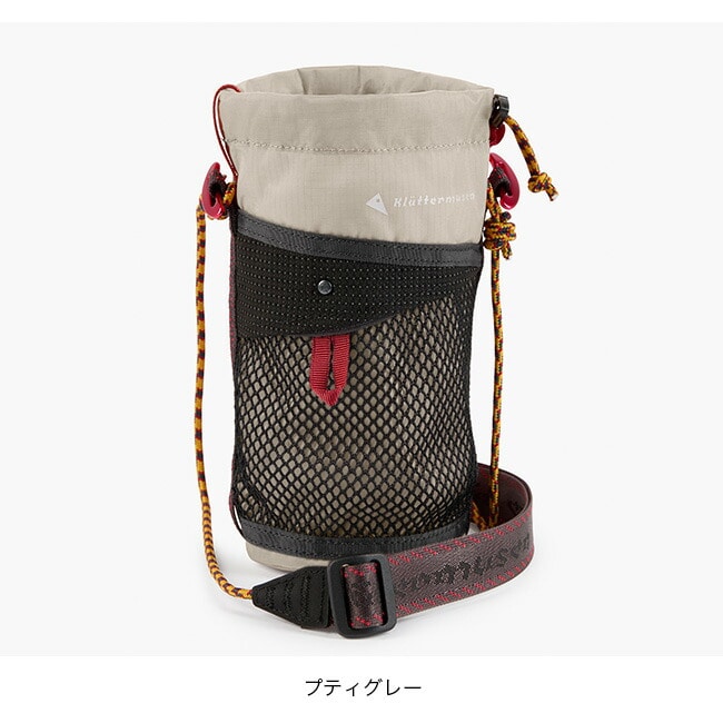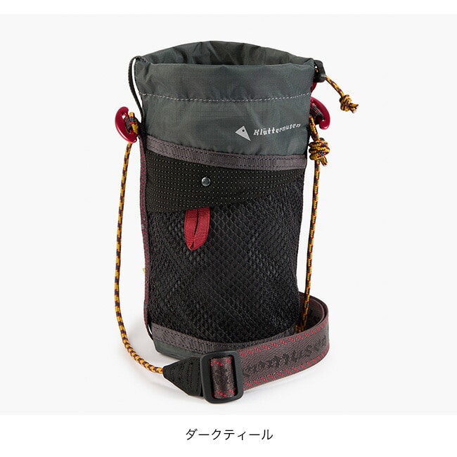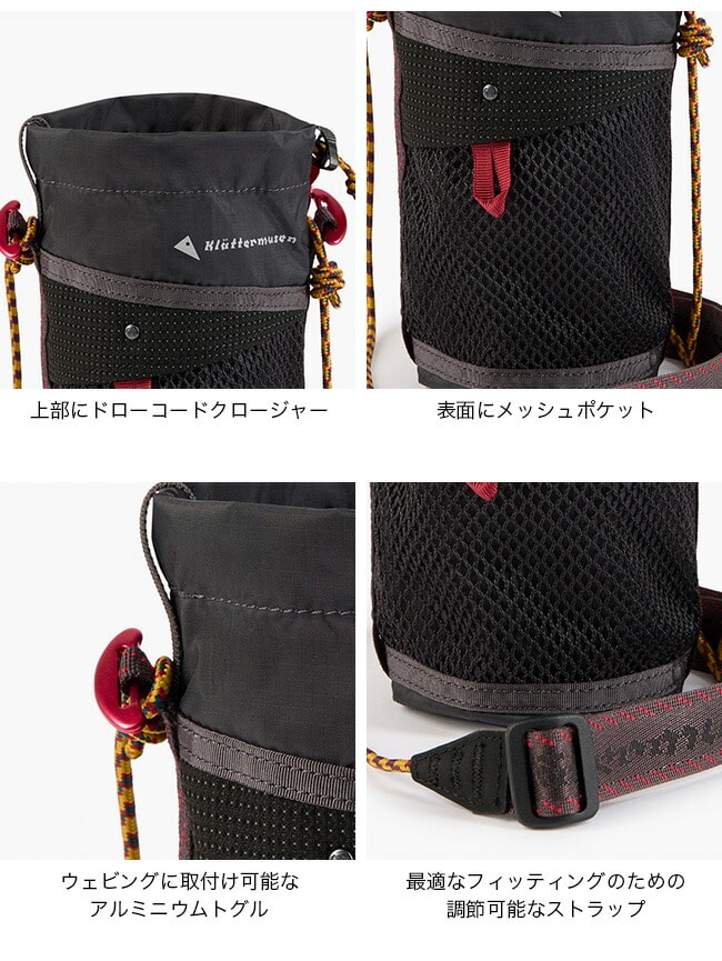 調節可能なコードによって自由なフィッティングが可能で、ドローコードクロージャーによってボトルを確実に固定します。外側のメッシュポケットには小物を収納可能で、赤色のアルミ製クイックアタッチトグルを使うことで、ウェビングループを備えたバックパックに固定することも可能です。